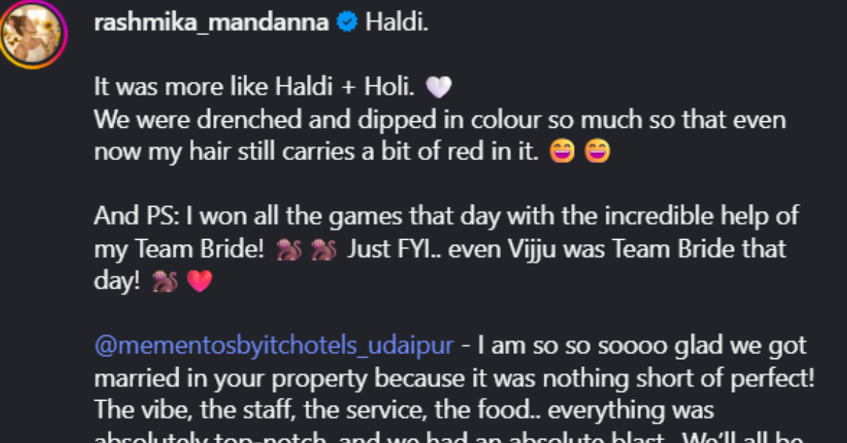 ಹಳದಿ ಶಾಸ್ತ್ರವೂ ಹೋಳಿಯಂತಿತ್ತು ಎಂದು ವಧು ರಶ್ಮಿಕಾ ಖುಷಿಯಿಂದ ಹೇಳಿಕೊಂಡಿದ್ದಾರೆ. ಅದಷ್ಟೇ ಅಲ್ಲ, ಅಂದು ನನ್ನ ತಂಡದ ಬೆಂಬಲದಿಂದ ನಾನು ಎಲ್ಲಾ ಗೇಮ್ಗಳನ್ನು ಗೆದ್ದಿದ್ದೆ, ಪತಿ ವಿಜು ಕೂಡ ನನ್ನ ಟೀಮ್ ಅನ್ನೇ ಸೇರಿಕೊಂಡಿದ್ರು ಎಂದು ಹೇಳಿದ್ದಾರೆ.