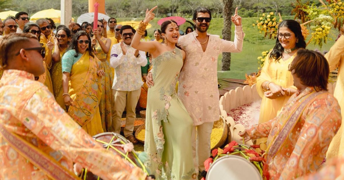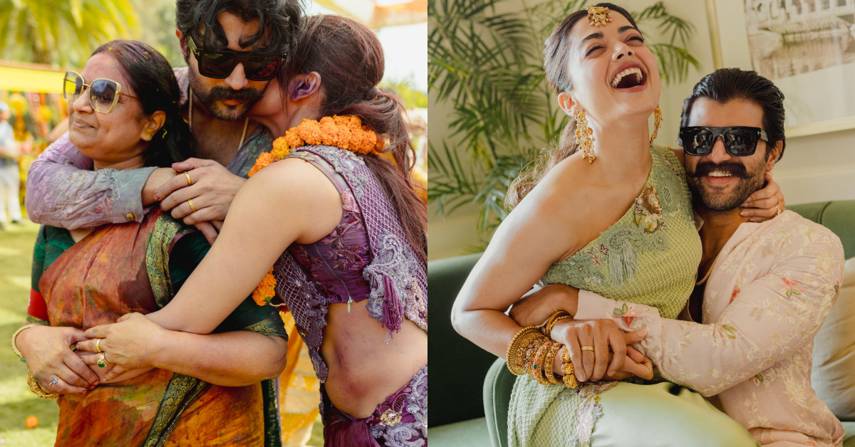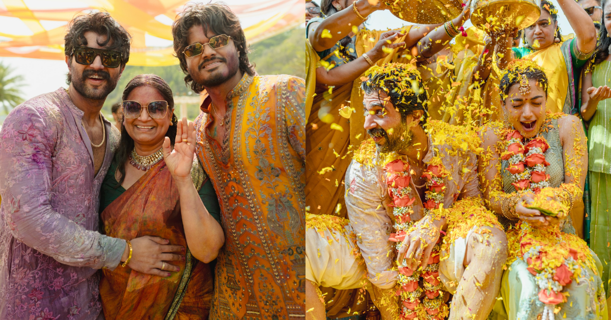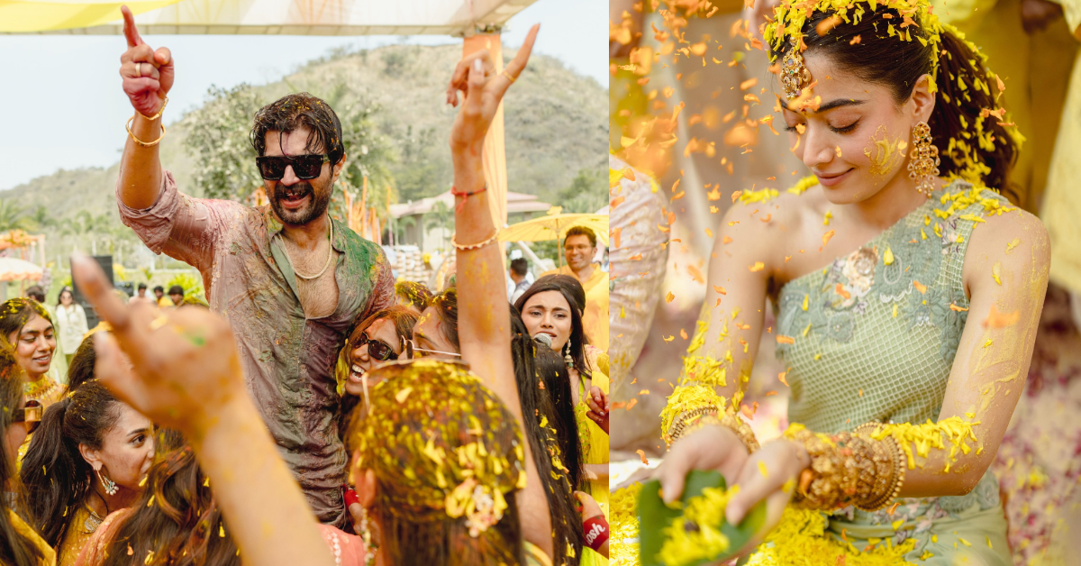 ಗಿಳಿ ಹಸಿರು ಬಣ್ಣದ ಧಿರಿಸಿನಲ್ಲಿ ಶ್ರೀವಲ್ಲಿ ರಶ್ಮಿಕಾ ಮಂದಣ್ಣ ಮಿಂಚಿದ್ರೆ, ಲೈಟ್ ಬಣ್ಣದ ಶೆರ್ವಾನಿಯಲ್ಲಿ ದೇವರಕೊಂಡ ಕಂಗೊಳಿಸಿದ್ರು. ಅರಿಶಿಣ ನೀರಿನಲ್ಲಿ ಇಬ್ಬರೂ ಮಿಂದೆದ್ದರು.