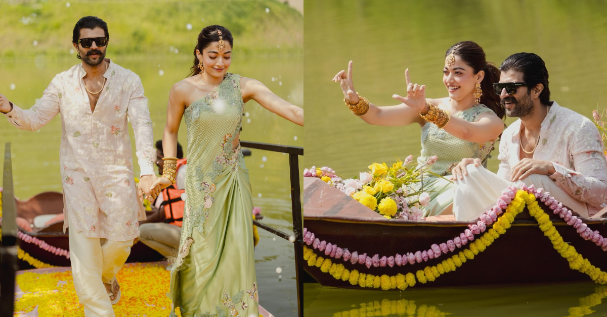 ಗಿಳಿ ಹಸಿರು ಬಣ್ಣದ ಧಿರಿಸಿನಲ್ಲಿ ಶ್ರೀವಲ್ಲಿ ರಶ್ಮಿಕಾ ಮಂದಣ್ಣ ಮಿಂಚಿದ್ರೆ, ಲೈಟ್ ಬಣ್ಣದ ಶೆರ್ವಾನಿಯಲ್ಲಿ ದೇವರಕೊಂಡ ಕಂಗೊಳಿಸಿದ್ರು. ಅರಿಶಿಣ ನೀರಿನಲ್ಲಿ ಇಬ್ಬರೂ ಮಿಂದೆದ್ದರು.